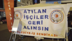 Belediyenin AKP’ye geçmesinin ardından işten atılan işçiler 24 Temmuz günü “işe iade davası”nı kazanmış; ancak belediye başkanı mahkeme kararına uyarak işçileri işe geri almadığı için belediyenin önünde direniş çadırı kurmuşlardı. 22 Ağustos günü polis, direniş çadırına saldırıp çadırı kaldırınca, bu defa işçiler AKP ilçe başkanlığının önüne kurdular direniş çadırlarını. Ve her gün sabahtan akşama kadar çadırda nöbet tutuyorlar.